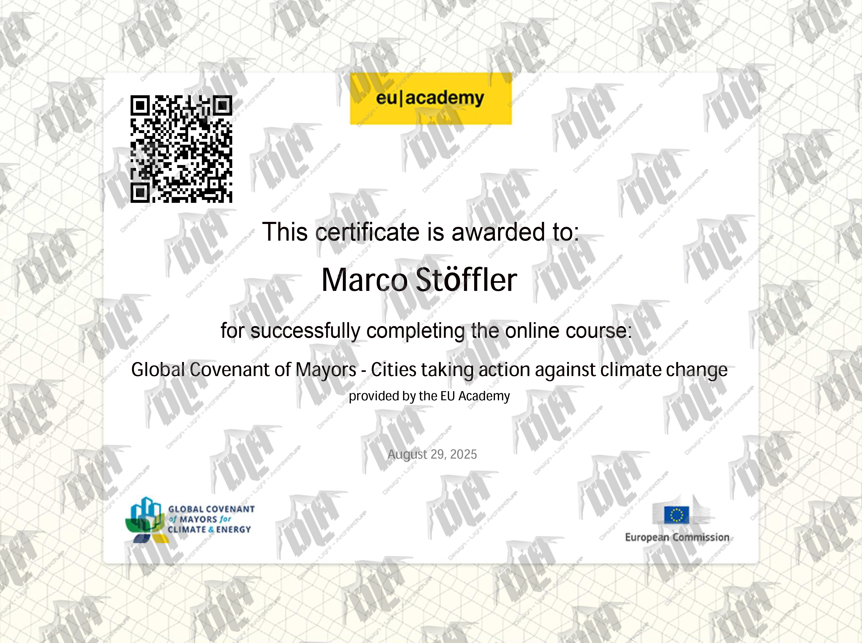 - 2025 Fortbildung/Teilname am Online-Kurs "Global Covenant of Mayors - Cities taking action against climate change" durch die "EU-Academy". (Gobal Covenant of Mayors for Climate & Energy)