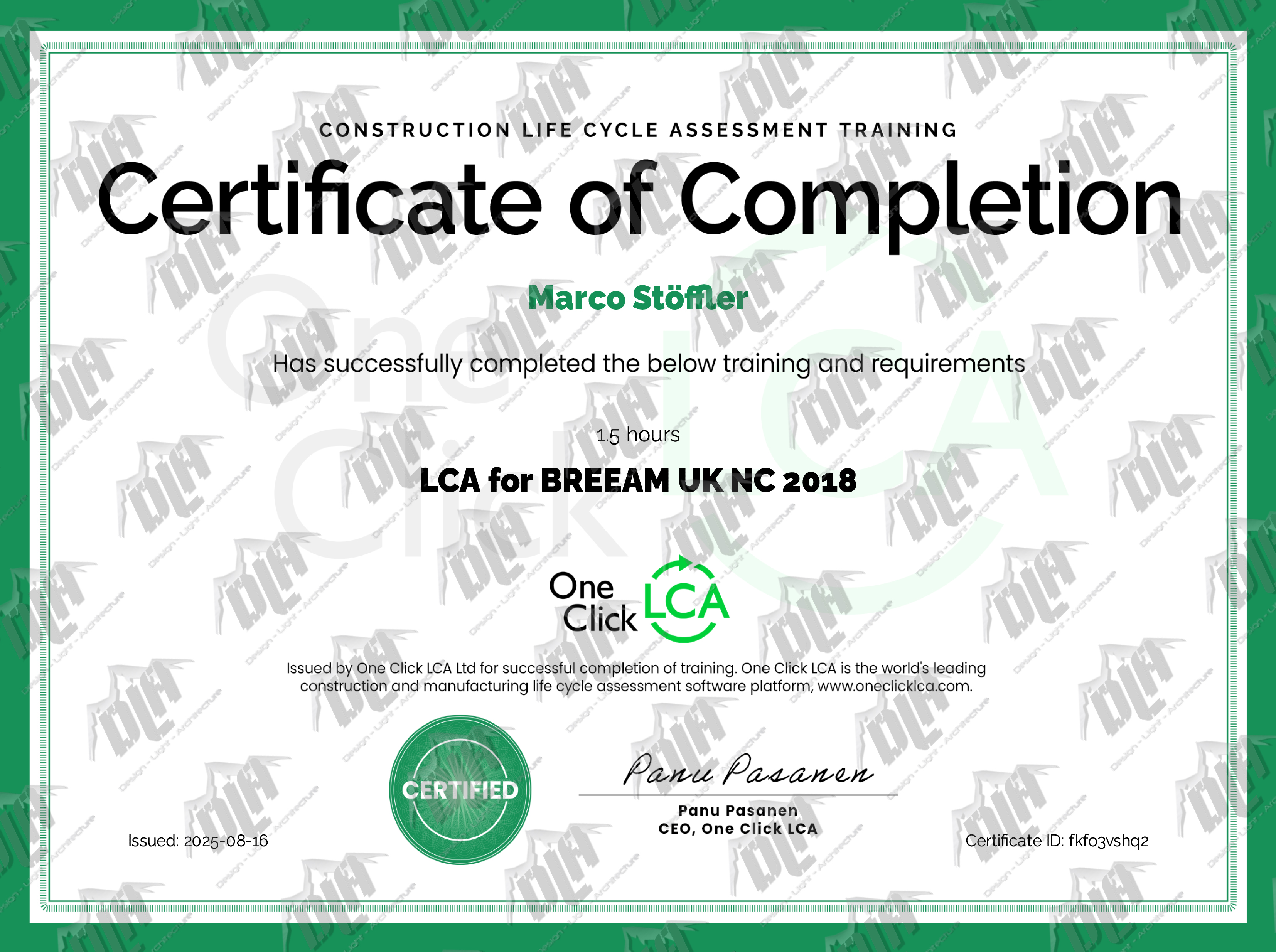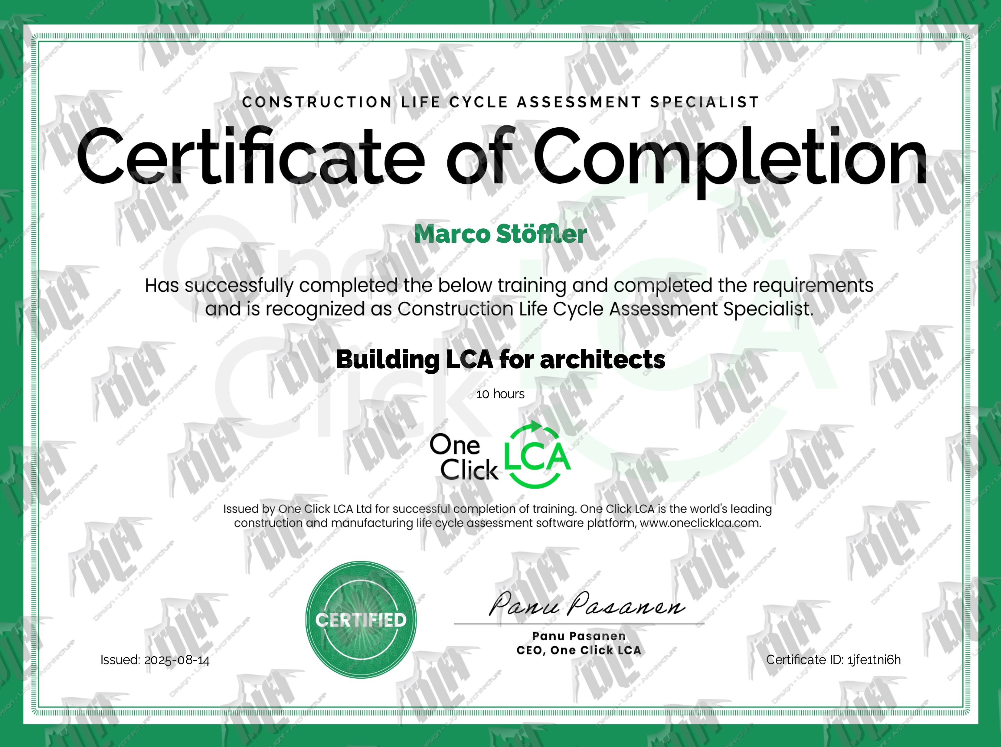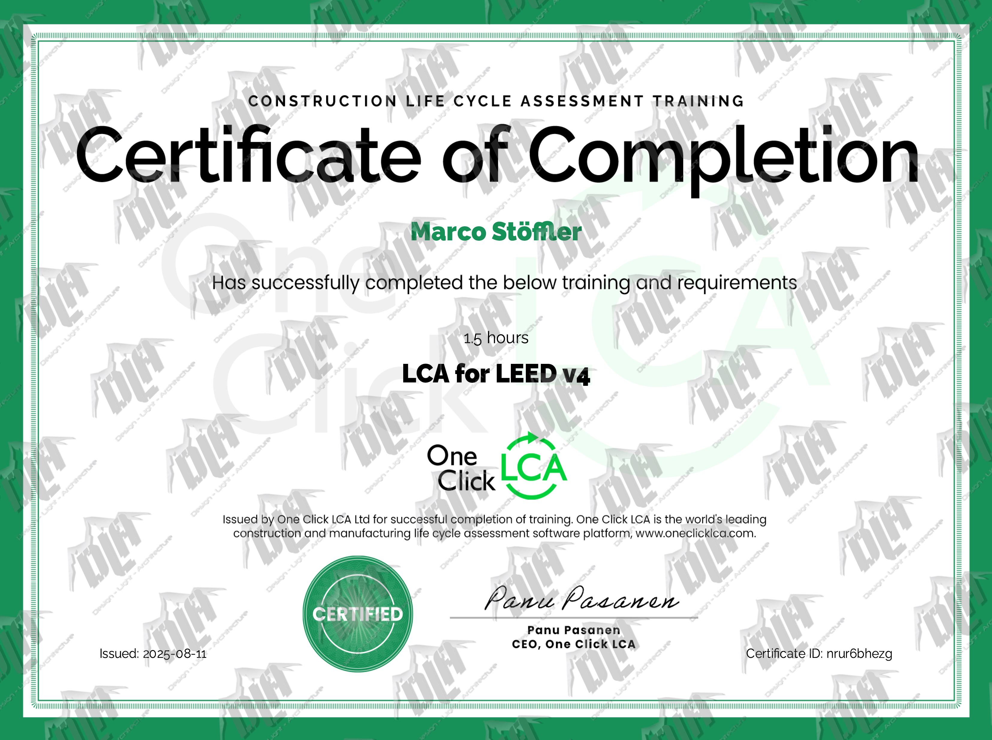 - 2025 Fortbildung in der Software "OneClick LCA®" im Hinblick auf EPD-, LCA-, LCC- Erstellungen/Analysen, sowie im Zusammenhang mit Rhino/Grasshopper-, Revit-, Excel- Datenverknüpfungen, als auch LCA Nachweisführung für LEED, DGNB und BREEAM. 1 , 2 , 3 , 4 , 5 , 6 , 7 , 8 , 9 , 10 , 11 , 12 , 13