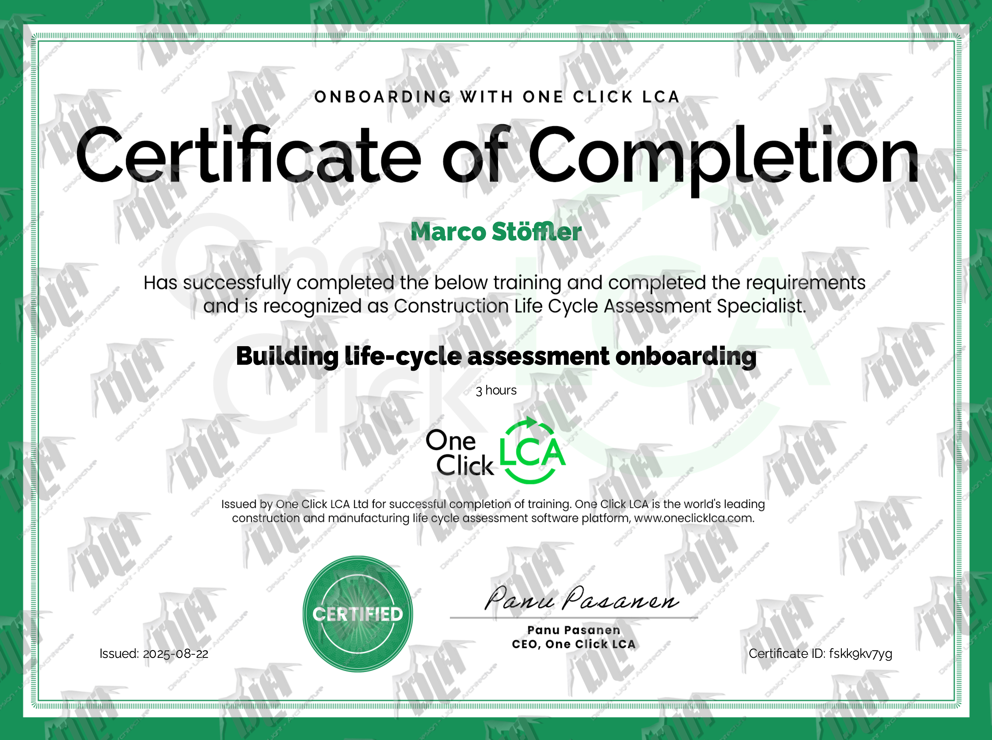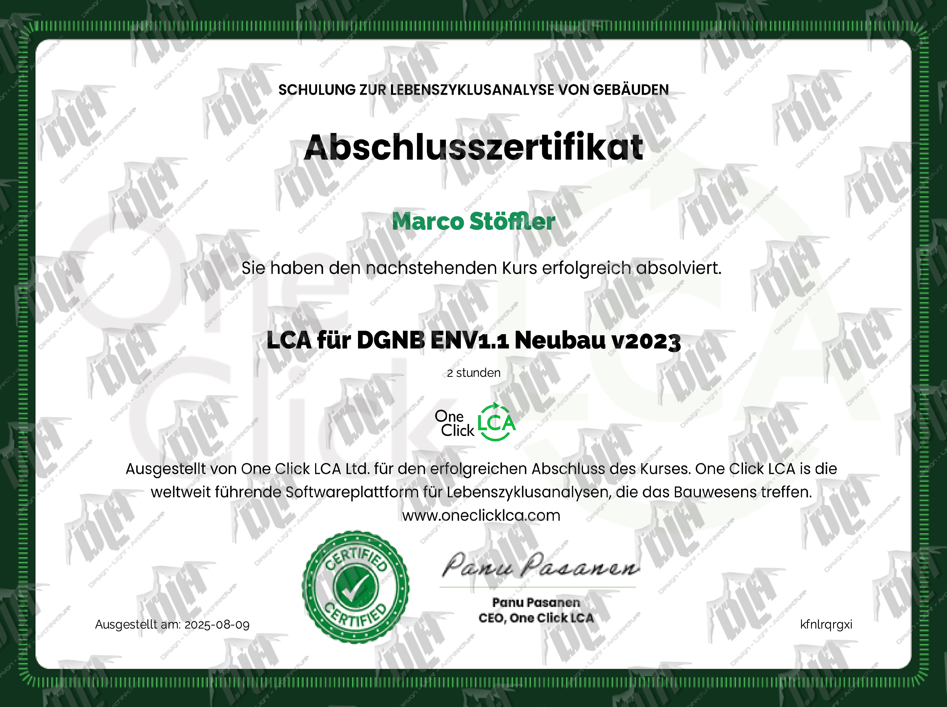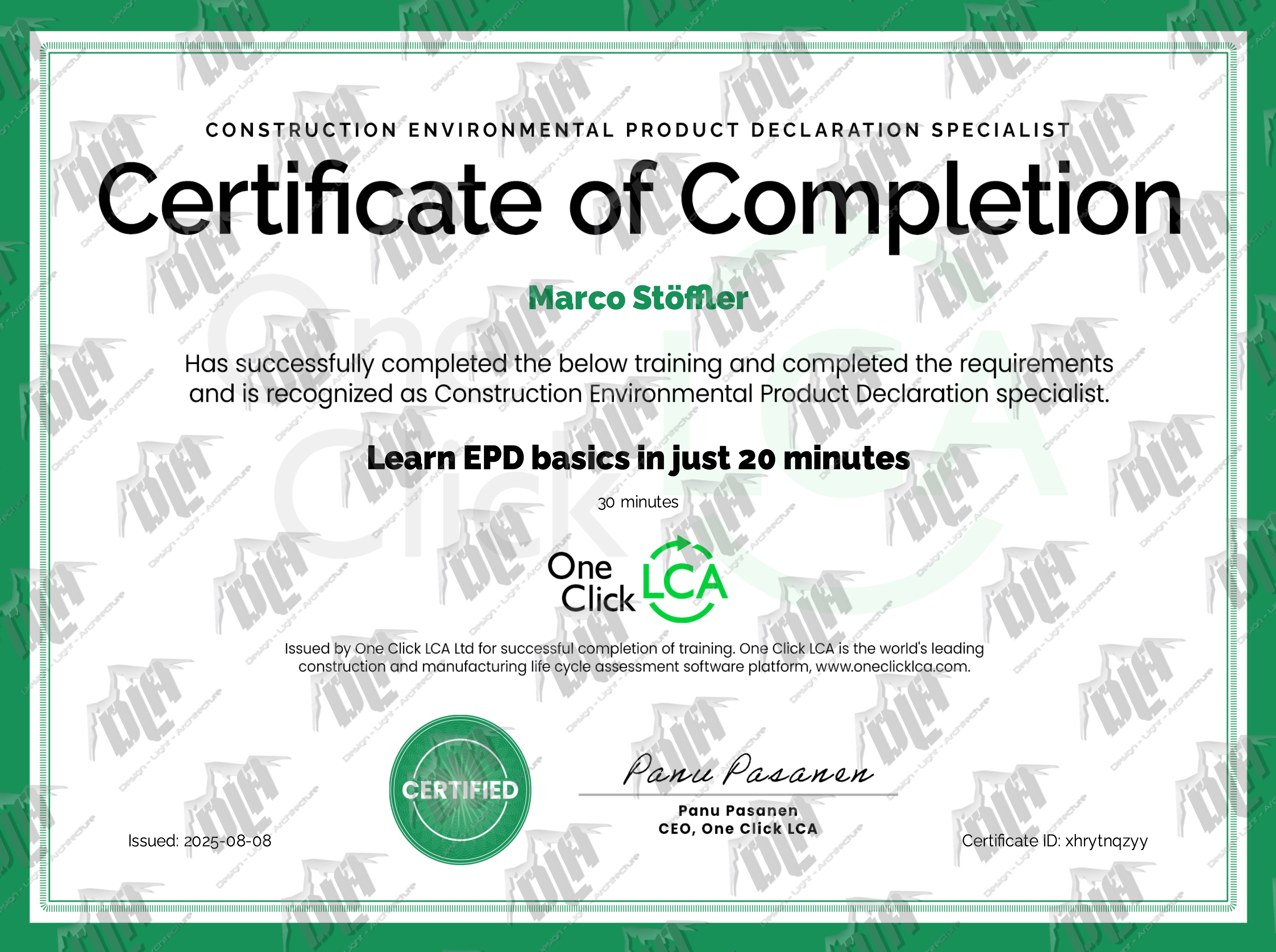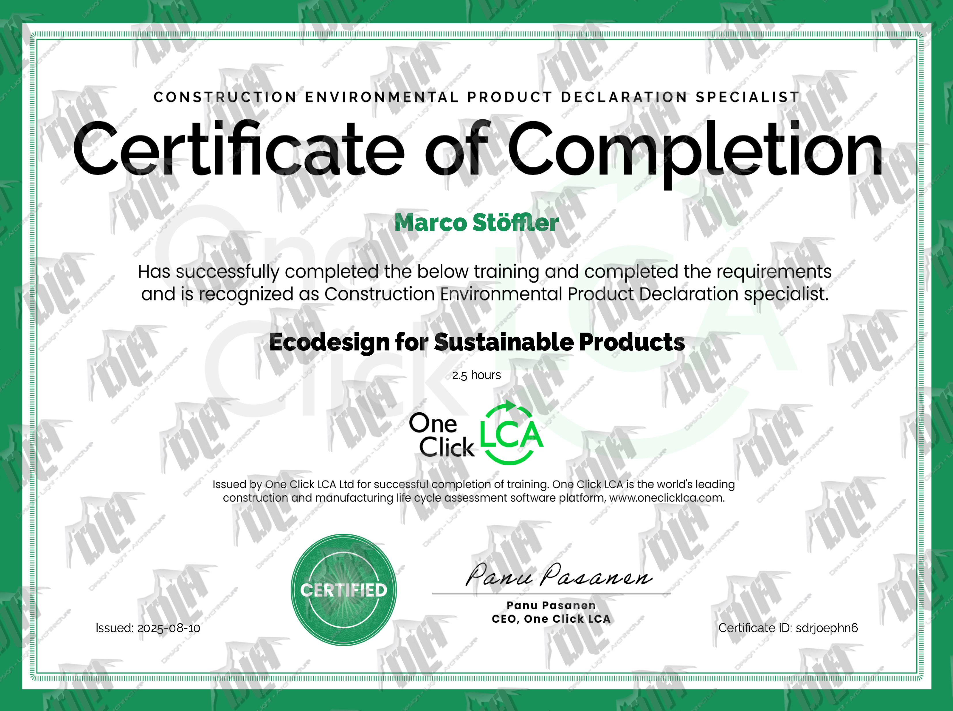 - 2025 Fortbildung in der Software "OneClick LCA®" im Hinblick auf EPD-, LCA-, LCC- Erstellungen/Analysen, sowie im Zusammenhang mit Rhino/Grasshopper-, Revit-, Excel- Datenverknüpfungen, als auch LCA Nachweisführung für LEED, DGNB und BREEAM. 1 , 2 , 3 , 4 , 5 , 6 , 7 , 8 , 9 , 10 , 11 , 12 , 13