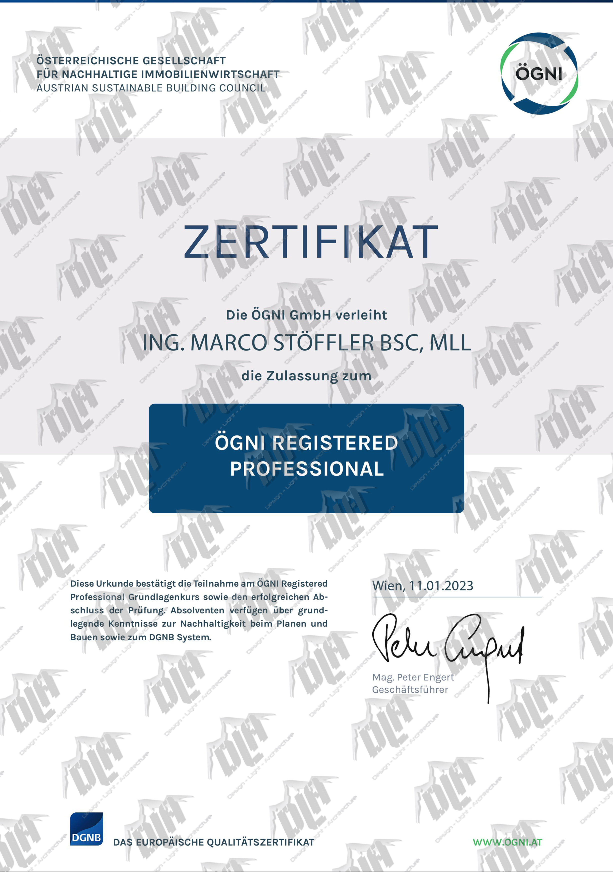 - 2023 Erlangung des Fortbildungstitels "ÖGNI Registered Professional" durch das "Austrian Sustainable Building Council".