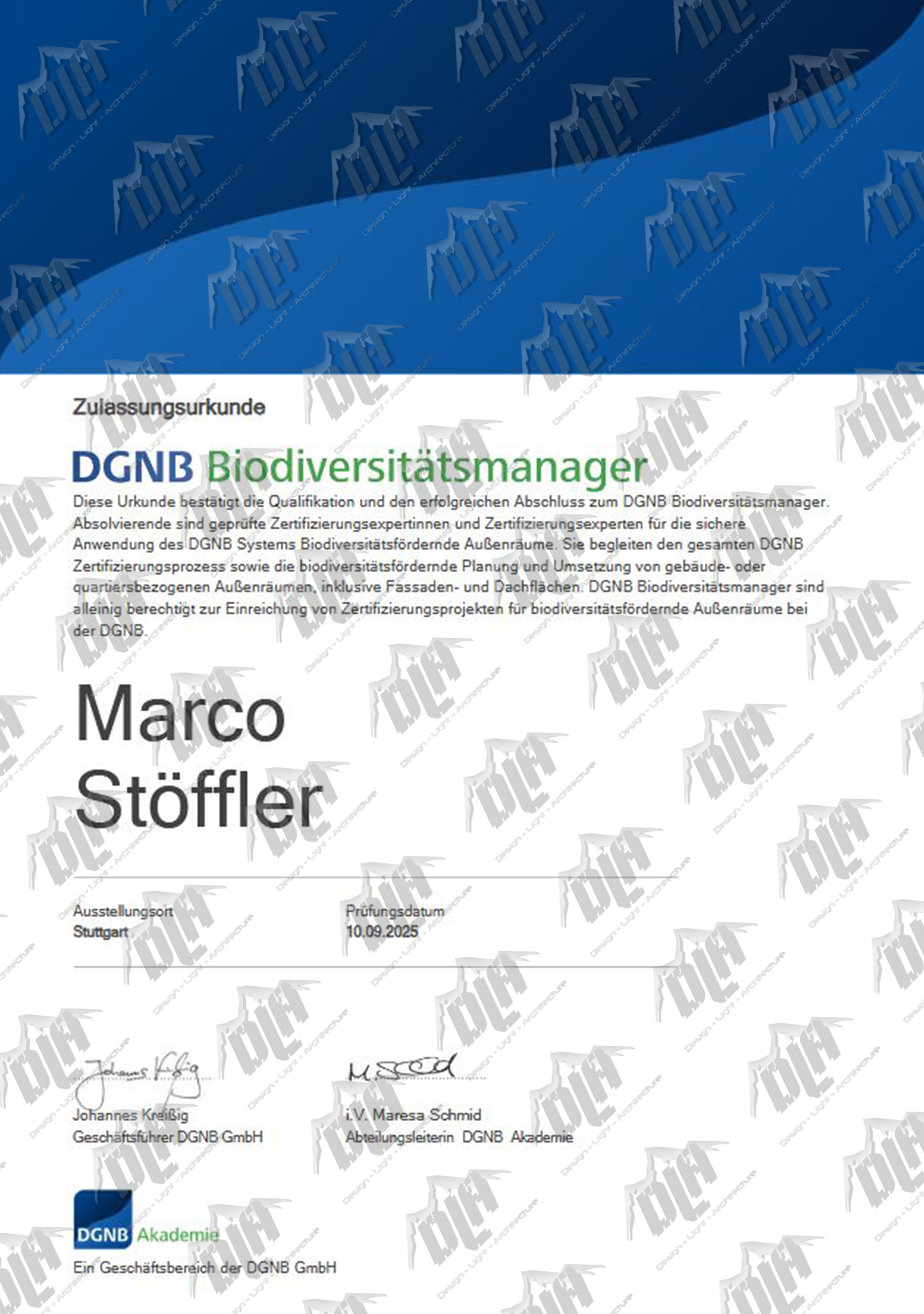 - 2025 Erlangung des Fortbildungstitels "DGNB Biodiversitätsmanager" durch die Akademie der "Deutsche Gesellschaft für Nachhaltiges Bauen" (DGNB e.V.).