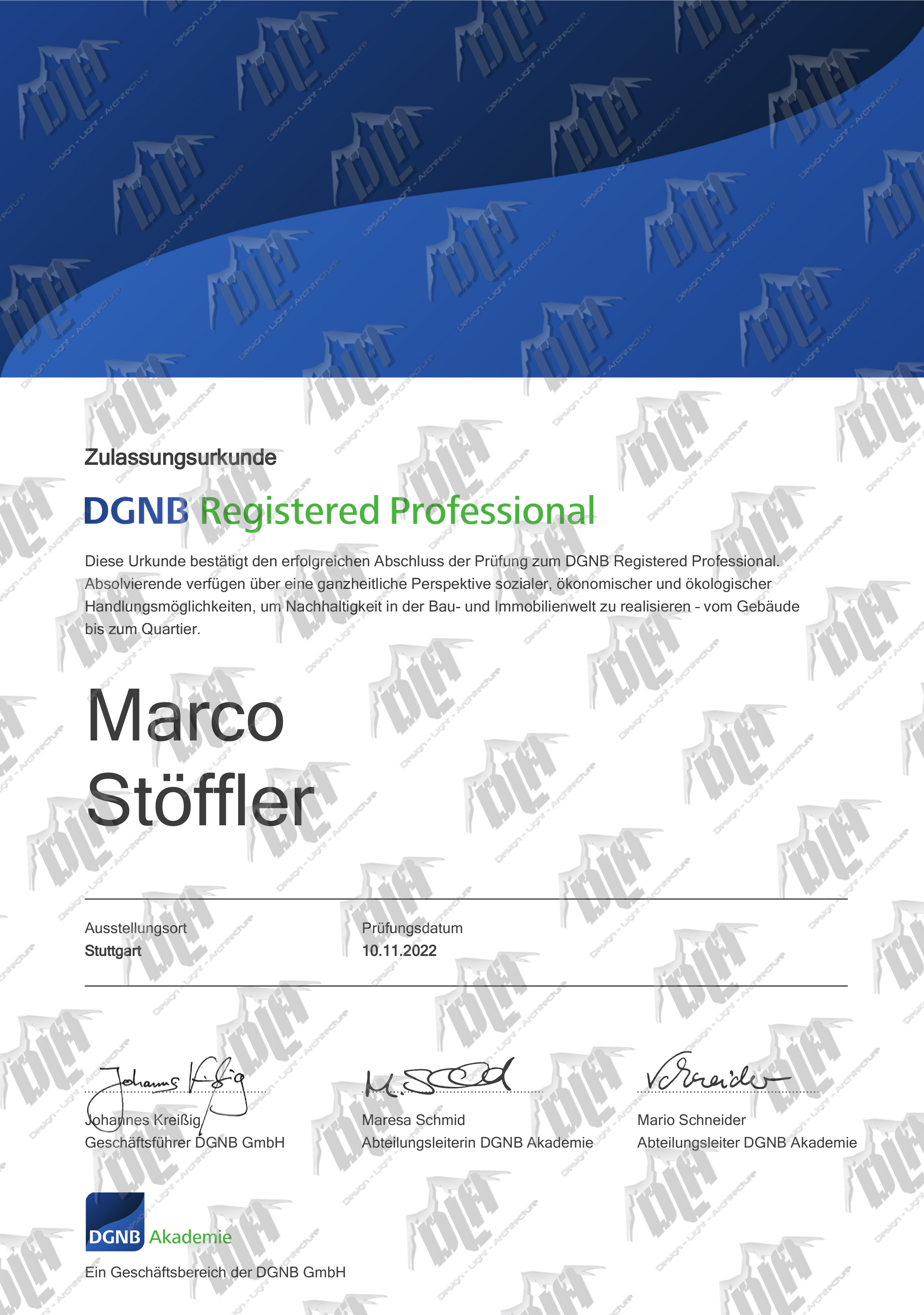 - 2022 Erlangung des Fortbildungstitels "DGNB Registered Professional" durch die Akademie der "Deutsche Gesellschaft für Nachhaltiges Bauen" (DGNB e.V.).
