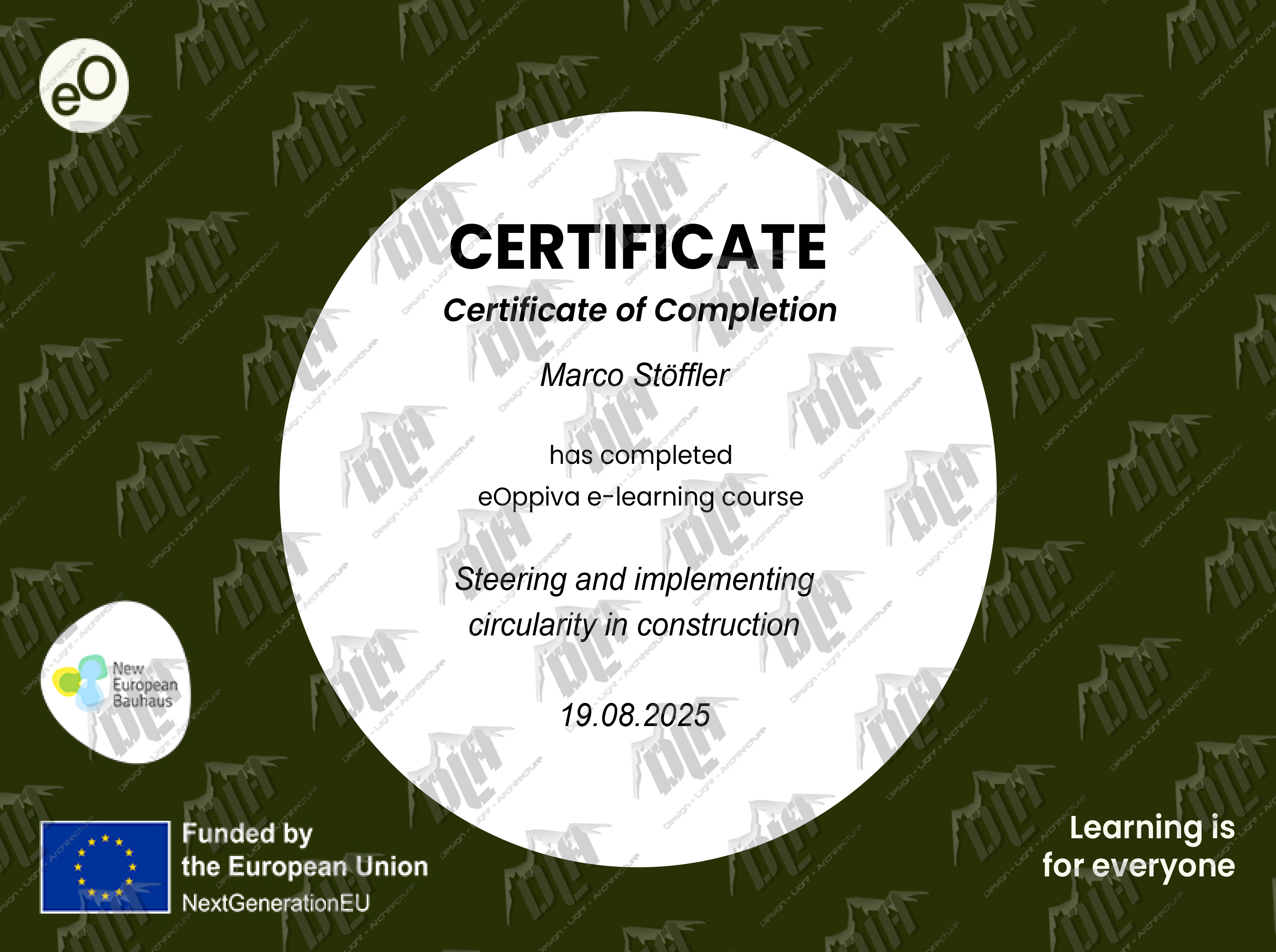 - 2025 Fortbildung bezüglich Kreislaufwirtschaft, Decarbonisierung, treibhausgasarme Materialien/Konstruktionen und LCA durch "eOppiva". 1 , 2 , 3 , 4 , 5 , 6 , 7 , 8